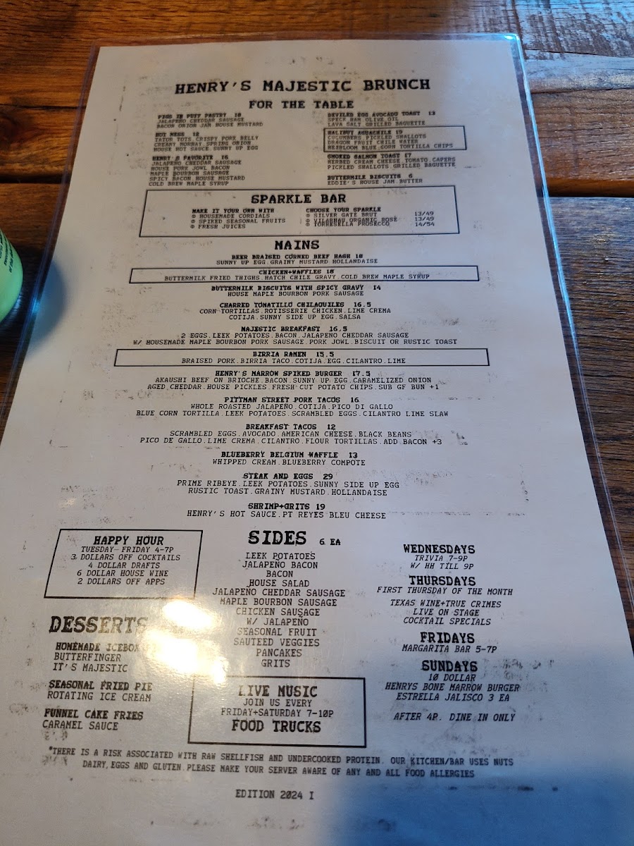 Welcome to Henry's Majestic, a vibrant dining destination nestled in the heart of Dallas. This eatery promises an eclectic menu that caters to diverse palates, ensuring every visit is a culinary adventure. Guests rave about the corned beef hash—a dish so memorable it keeps diners coming back for more. The lively atmosphere is enhanced by live music, particularly during the weekends, making it a perfect spot for brunch or a night out.